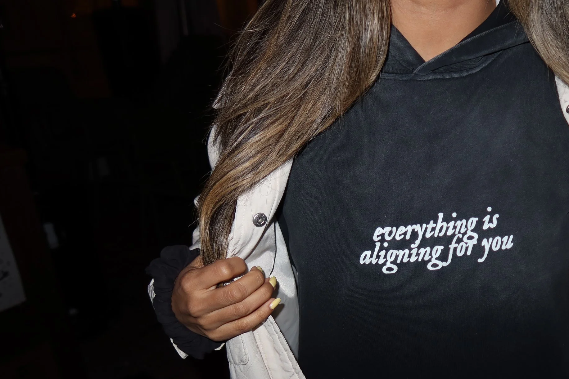 The front expresses everything is aligning for you; and the back “you are the universe experiencing itself.” Together these phrases act as a wearable affirmation that alignment is not something we chase, but something we fully embody. We are not separate from the life we desire, but the active creators within it.